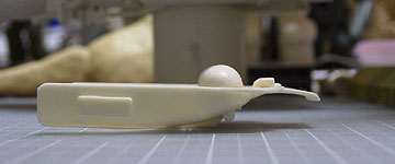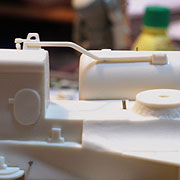 バスタブは塗装やサフ吹きを考慮し、仮組がすべて終わるまで接着は待ってください。最終的にはめがねやタンクの突起など、バスタブに接地している箇所に瞬着を流し込んで固定します。万全を期すために、バスタブの後方とノズル部の大きなわっかのパーツが接地しているところに1mmくらいの真ちゅう線を突貫させるのもいいでしょう。