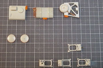 次ブロックのものも含みますが、バリを除去します。四角いめがねを真ん中で割ったようなパーツ(以下:めがね)はお間違えのないように。四隅の穴は0.8〜1.0mmのピンバイスで穴を開けてディテールUPします。また、約8.5mmのレンズは、キット付属のものを使う際は、収縮率の差により本体に付けるとキツいので回りをほんの少し削るといいでしょう。
