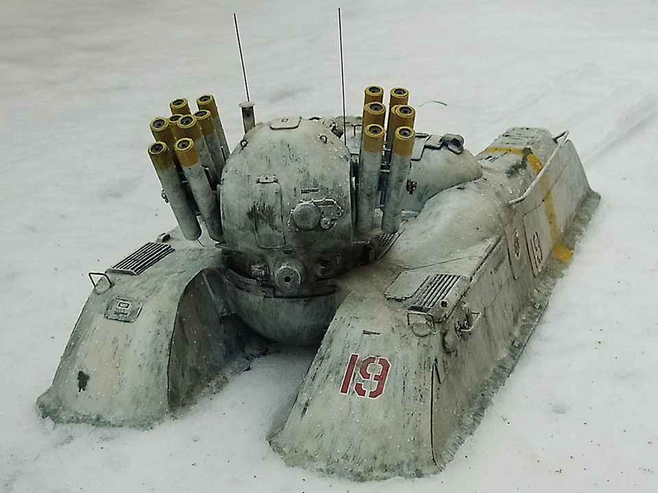 スフィンクスは月刊ホビージャパン1984年1月号掲載の「SF3Dオリジナル」に登場したシュトラール軍の大型野戦自走ロケット砲です。傭兵軍の自走ロケットランチャー・ドールハウスに苦しめられたシュトラール軍は、大口径で長射程の自走支援兵器の必要性を痛感し、ツインテール式のホバー走行システムを備えた野戦自走ロケット砲スフィンクスを開発します。ナッツロッカーよりも巨大な13.3mのスフィンクスは時速95kmで走行が可能で、19cm重ロケットチューブを合計16本搭載。射程、破壊力ともにドールハウスの18.2cmロケットランチャーを上回り、『SF3D』の登場兵器の中でもかなり強い兵器に位置付けられています。